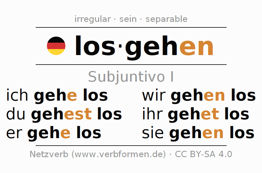 El verbo losgehen, conjugado completamente en todas las personas y números gramaticales en Subjuntivo Presente.