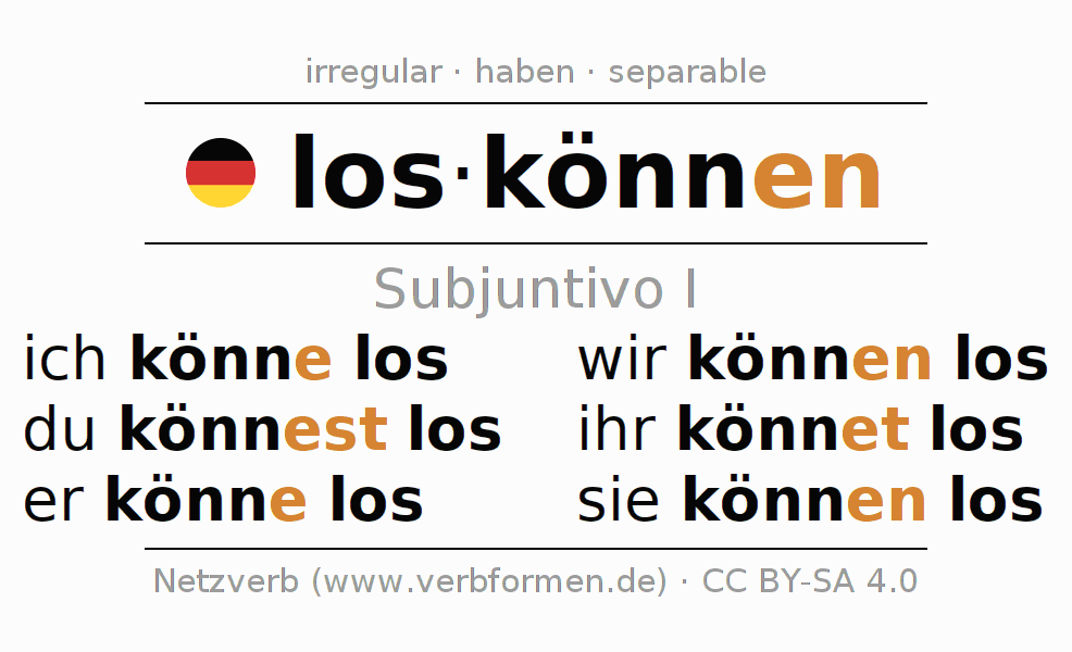 El verbo loskönnen, conjugado completamente en todas las personas y números gramaticales en Subjuntivo Presente.