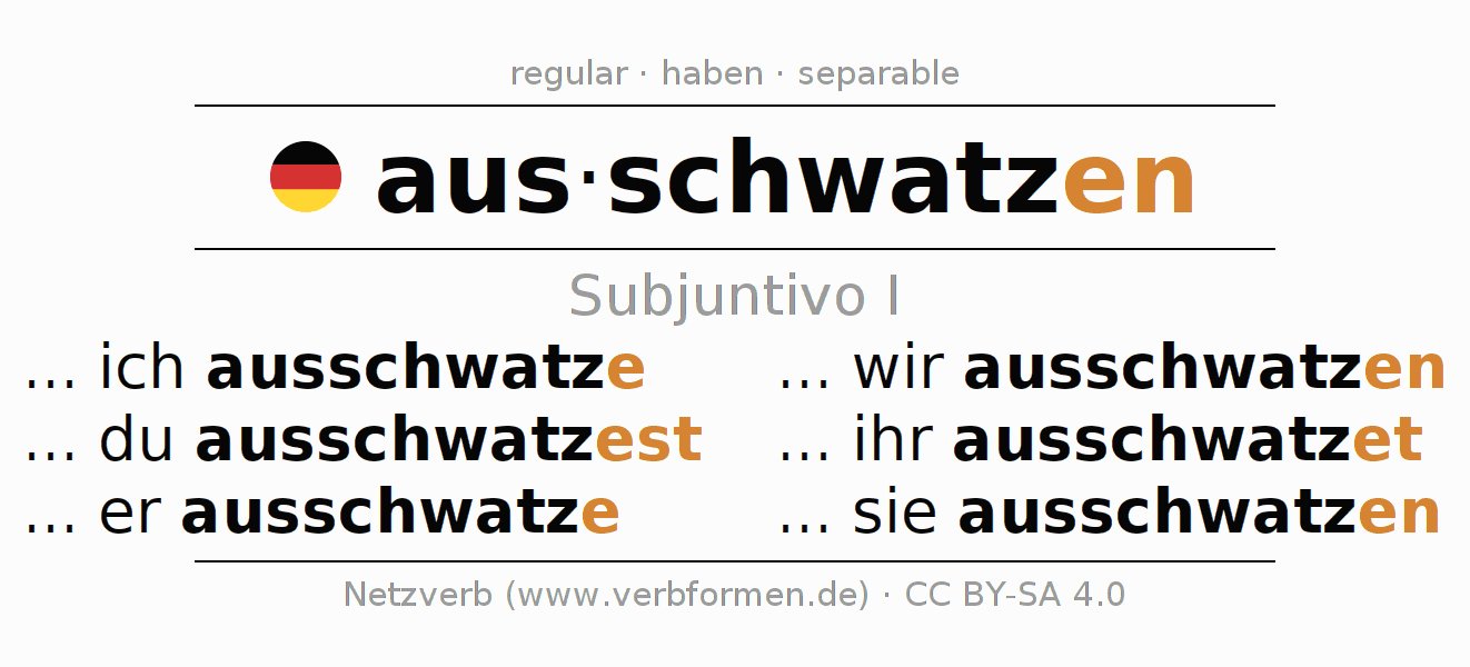 El verbo ausschwatzen, conjugado completamente en todas las personas y números gramaticales en Subjuntivo Presente.