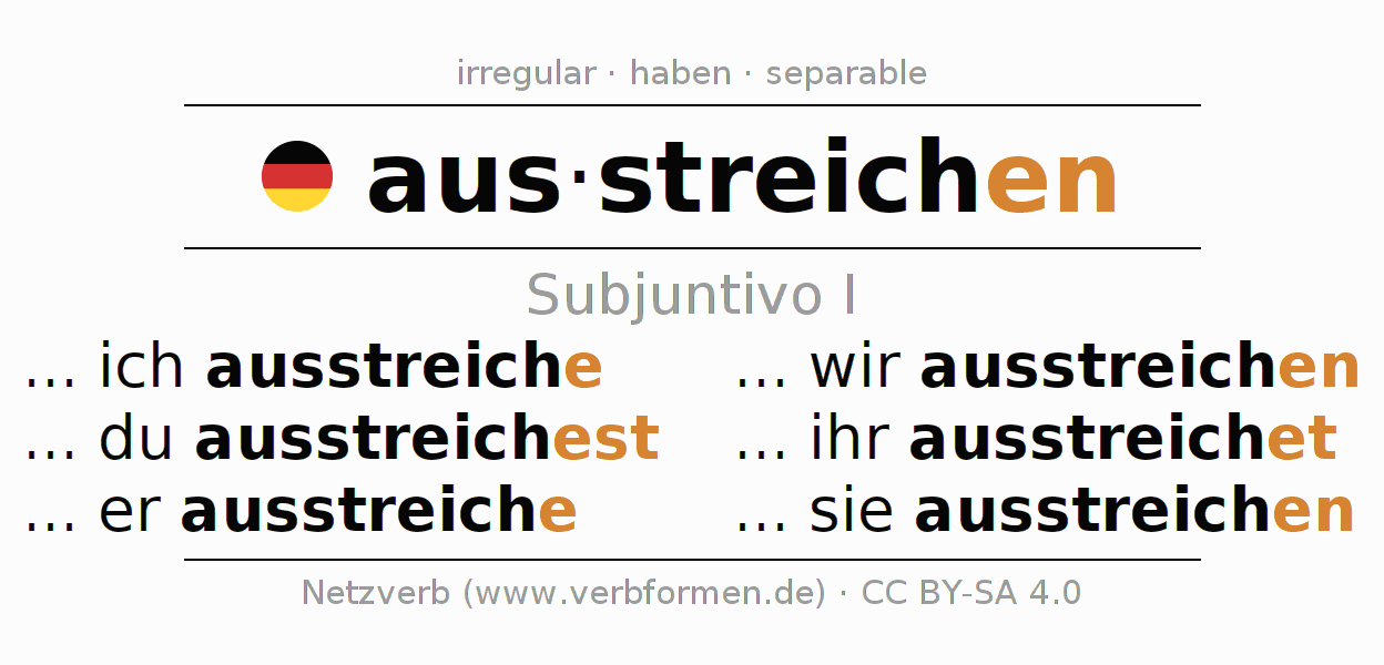 El verbo ausstreichen, conjugado completamente en todas las personas y números gramaticales en Subjuntivo Presente.