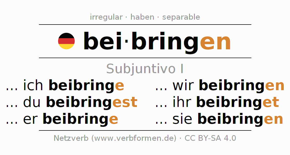La conjugación de beibringen en Subjuntivo Presente Subjuntivo Activo es ... ich beibringe, ... du beibringest, ... er beibringe, ... wir beibringen, ... ihr beibringet, ... sie beibringen.Para construir esta formas se requiere seguir algunas reglas gramaticales y también las especificaciones para la conjugación de verbos simples de beibringen en Subjuntivo I . Comentarios ☆
