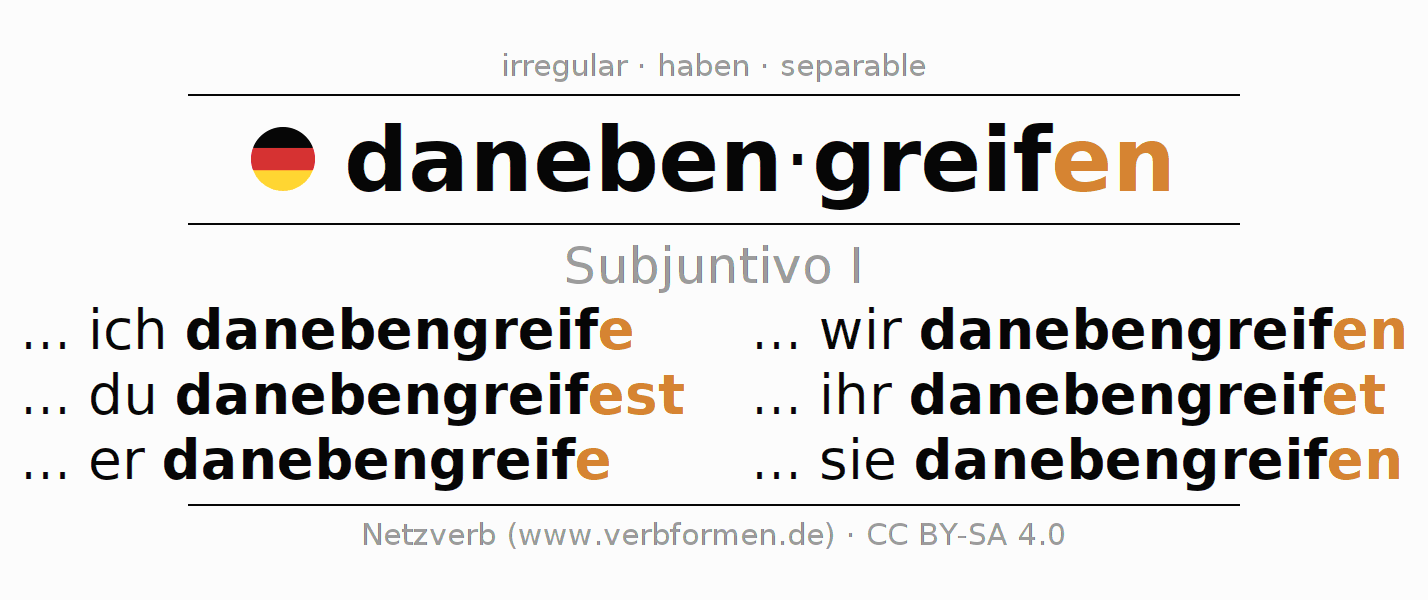 La conjugación de danebengreifen en Subjuntivo Presente Subjuntivo Activo es ... ich danebengreife, ... du danebengreifest, ... er danebengreife, ... wir danebengreifen, ... ihr danebengreifet, ... sie danebengreifen.Para construir esta formas se requiere seguir algunas reglas gramaticales y también las especificaciones para la conjugación de verbos simples de danebengreifen en Subjuntivo I . Comentarios ☆