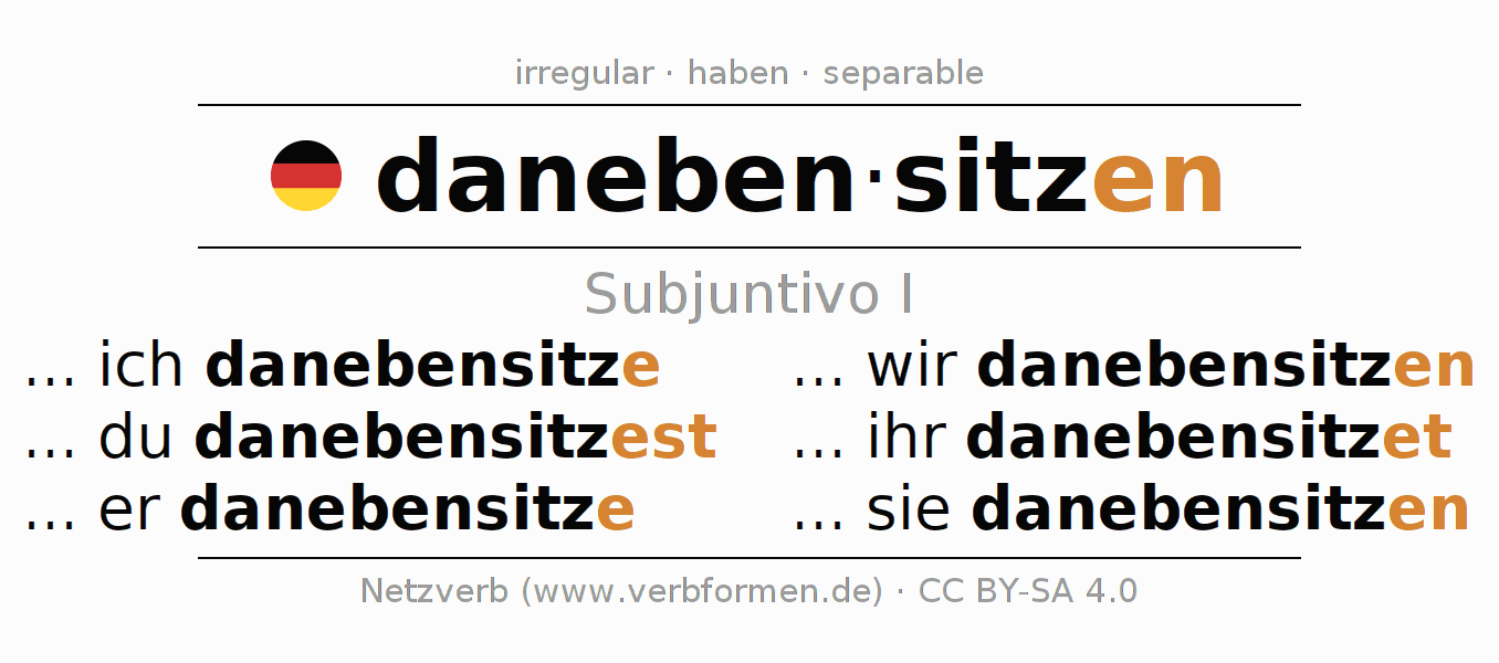 La conjugación de danebensitzen en Subjuntivo Presente Subjuntivo Activo es ... ich danebensitze, ... du danebensitzest, ... er danebensitze, ... wir danebensitzen, ... ihr danebensitzet, ... sie danebensitzen.Para construir esta formas se requiere seguir algunas reglas gramaticales y también las especificaciones para la conjugación de verbos simples de danebensitzen en Subjuntivo I . Comentarios ☆