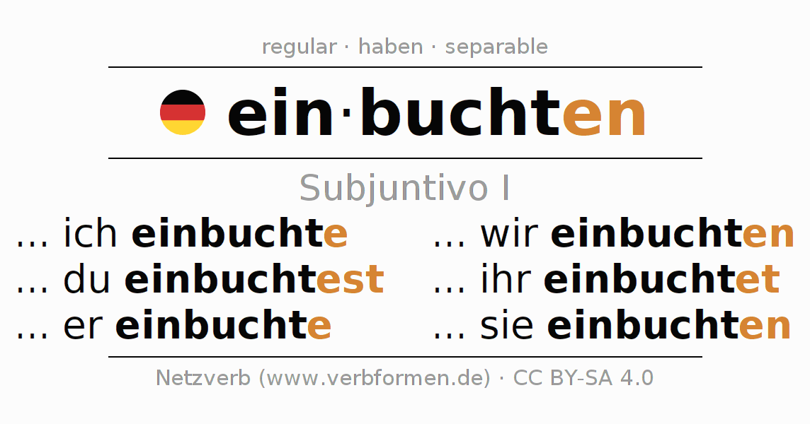 El verbo einbuchten, conjugado completamente en todas las personas y números gramaticales en Subjuntivo Presente.