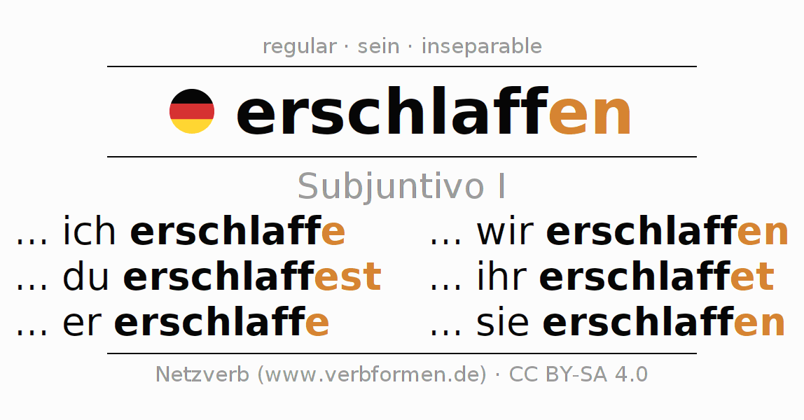 El verbo erschlaffen (ist), conjugado completamente en todas las personas y números gramaticales en Subjuntivo Presente.