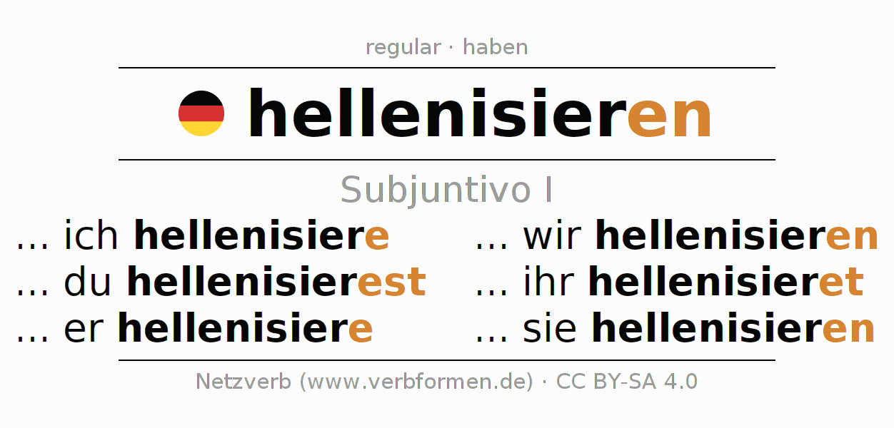 El verbo hellenisieren, conjugado completamente en todas las personas y números gramaticales en Subjuntivo Presente.