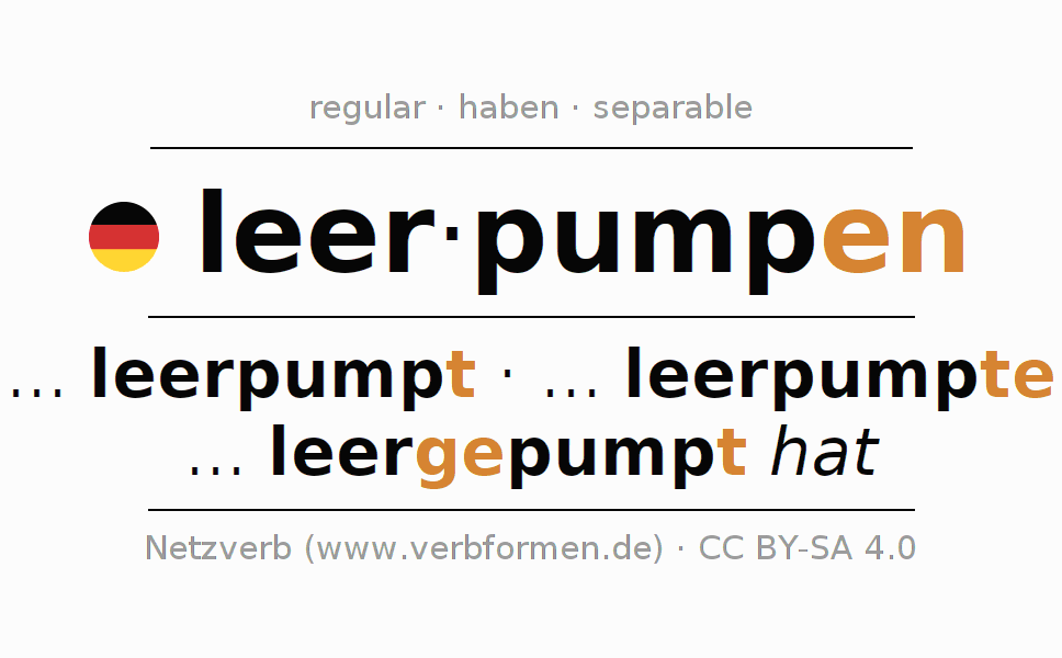La conjugación de leerpumpen en Subjuntivo Presente Subjuntivo Activo es ... ich leerpumpe, ... du leerpumpest, ... er leerpumpe, ... wir leerpumpen, ... ihr leerpumpet, ... sie leerpumpen.Para construir esta formas se requiere seguir algunas reglas gramaticales y también las especificaciones para la conjugación de verbos simples de leerpumpen en Subjuntivo I . Comentarios ☆
