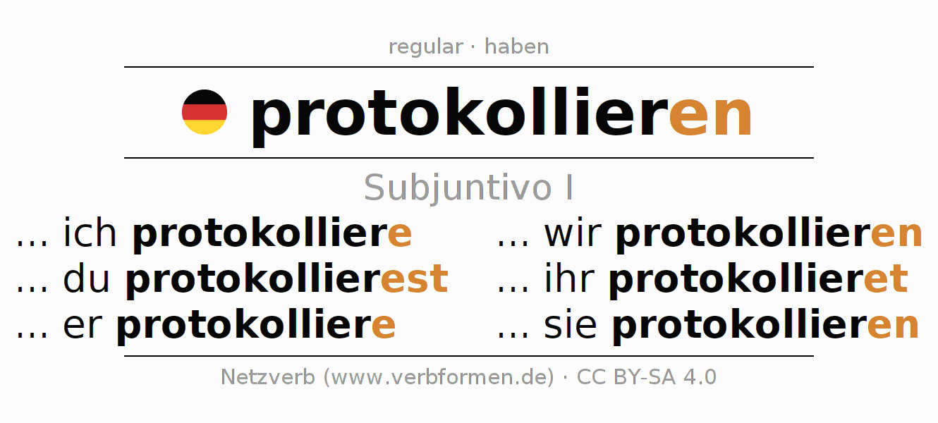 El verbo protokollieren, conjugado completamente en todas las personas y números gramaticales en Subjuntivo Presente.