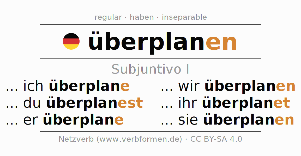 El verbo überplanen, conjugado completamente en todas las personas y números gramaticales en Subjuntivo Presente.