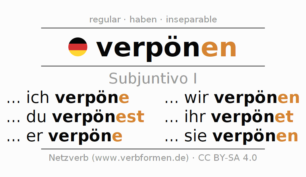 El verbo verpönen, conjugado completamente en todas las personas y números gramaticales en Subjuntivo Presente.