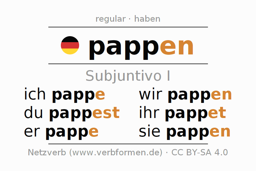 Este verbo pappen (adhesión, pegar) se conjuga en subjuntivo I de la siguiente manera: ich pappe, du pappest, er pappe, wir pappen, ihr pappet, sie pappen