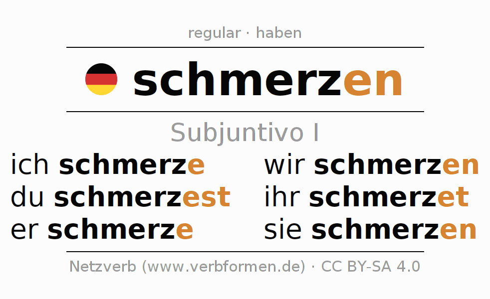 Este verbo schmerzen (doler, dolor) se conjuga en subjuntivo I de la siguiente manera: ich schmerze, du schmerzest, er schmerze, wir schmerzen, ihr schmerzet, sie schmerzen