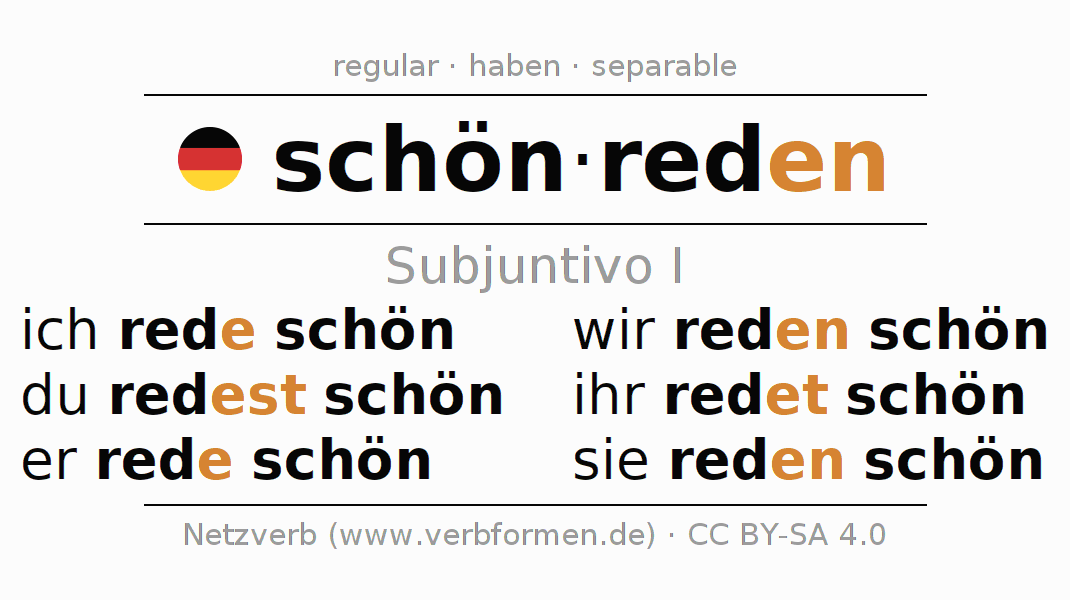 El verbo schönreden, conjugado completamente en todas las personas y números gramaticales en Subjuntivo Presente.