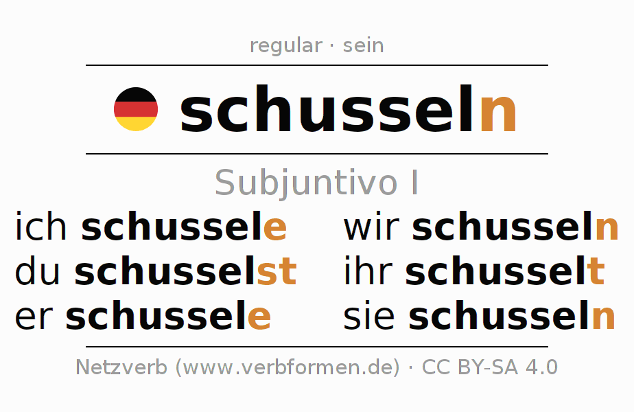 El verbo schusseln (ist), conjugado completamente en todas las personas y números gramaticales en Subjuntivo Presente.