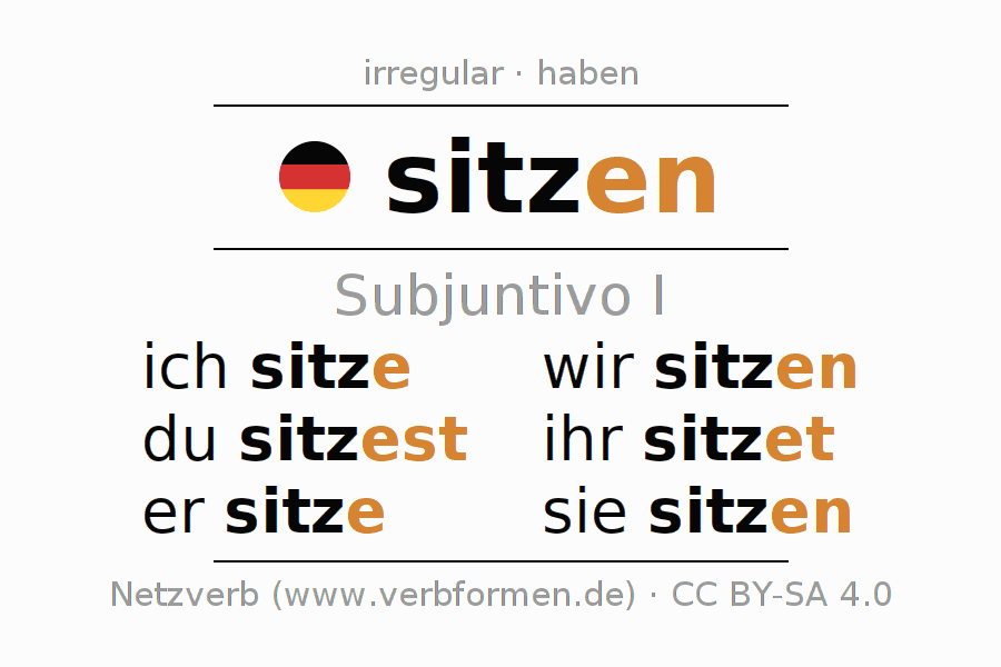Este verbo sitzen (estar sentado, sentarse) se conjuga en subjuntivo I de la siguiente manera: ich sitze, du sitzest, er sitze, wir sitzen, ihr sitzet, sie sitzen