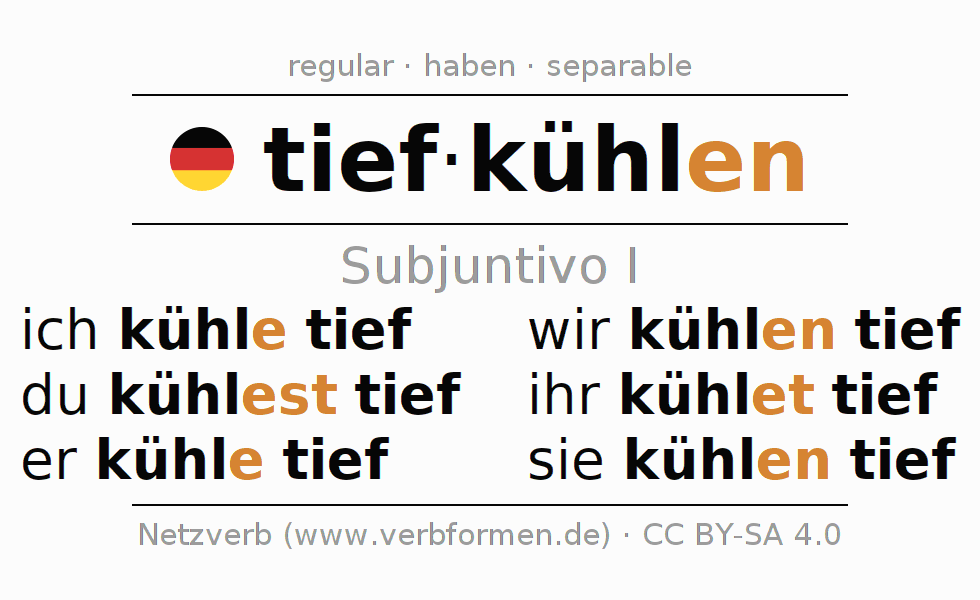 Este verbo tiefkühlen (congelar, sobrecongelar) se conjuga en subjuntivo I de la siguiente manera: ich kühle tief, du kühlest tief, er kühle tief, wir kühlen tief, ihr kühlet tief, sie kühlen tief