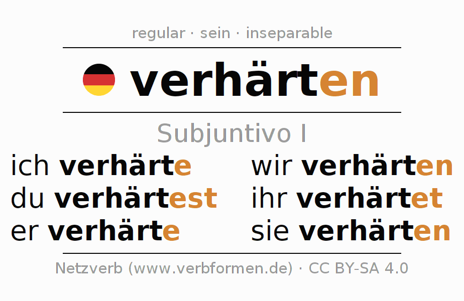 El verbo verhärten, conjugado completamente en todas las personas y números gramaticales en Subjuntivo Presente.