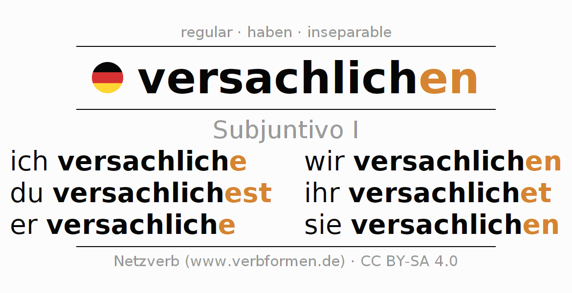 El verbo versachlichen, conjugado completamente en todas las personas y números gramaticales en Subjuntivo Presente.