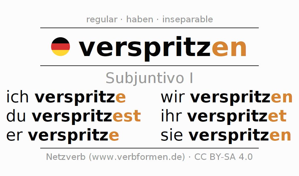 Este verbo verspritzen (rociar, esparcir) se conjuga en subjuntivo I de la siguiente manera: ich verspritze, du verspritzest, er verspritze, wir verspritzen, ihr verspritzet, sie verspritzen