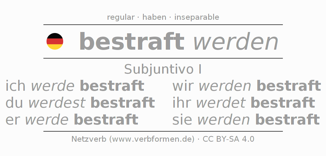 La conjugación de bestrafen en Subjuntivo Presente Subjuntivo Pasivo procesivo es ich werde bestraft, du werdest bestraft, er werde bestraft, wir werden bestraft, ihr werdet bestraft, sie werden bestraft.Para construir esta formas se requiere seguir algunas reglas gramaticales y también las especificaciones para la conjugación de verbos simples de bestrafen en Subjuntivo I . Comentarios ☆