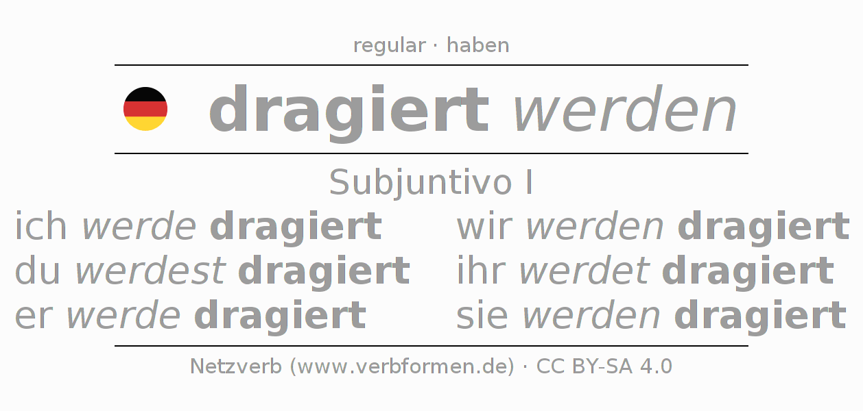 La conjugación de dragieren en Subjuntivo Presente Subjuntivo Pasivo procesivo es ich werde dragiert, du werdest dragiert, er werde dragiert, wir werden dragiert, ihr werdet dragiert, sie werden dragiert.Para construir esta formas se requiere seguir algunas reglas gramaticales y también las especificaciones para la conjugación de verbos simples de dragieren en Subjuntivo I . Comentarios ☆