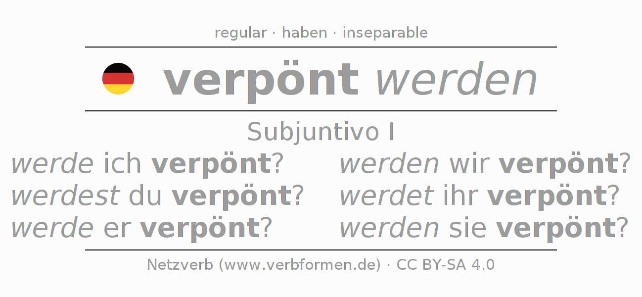 El verbo verpönen, conjugado completamente en todas las personas y números gramaticales en Subjuntivo Presente.