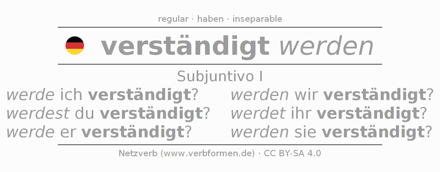 La conjugación de verständigen en Subjuntivo Presente Subjuntivo Pasivo procesivo es werde ich verständigt?, werdest du verständigt?, werde er verständigt?, werden wir verständigt?, werdet ihr verständigt?, werden sie verständigt?.Para construir esta formas se requiere seguir algunas reglas gramaticales y también las especificaciones para la conjugación de verbos simples de verständigen en Subjuntivo I . Comentarios ☆