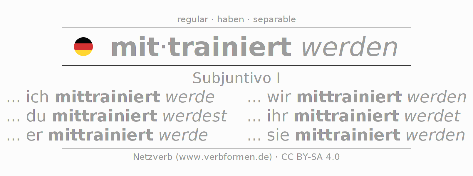 El verbo mittrainieren, conjugado completamente en todas las personas y números gramaticales en Subjuntivo Presente.