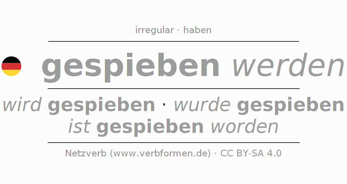 La conjugación de speiben en Subjuntivo Presente Subjuntivo Pasivo procesivo es ich werde gespieben, du werdest gespieben, er werde gespieben, wir werden gespieben, ihr werdet gespieben, sie werden gespieben.Para construir esta formas se requiere seguir algunas reglas gramaticales y también las especificaciones para la conjugación de verbos simples de speiben en Subjuntivo I . Comentarios ☆