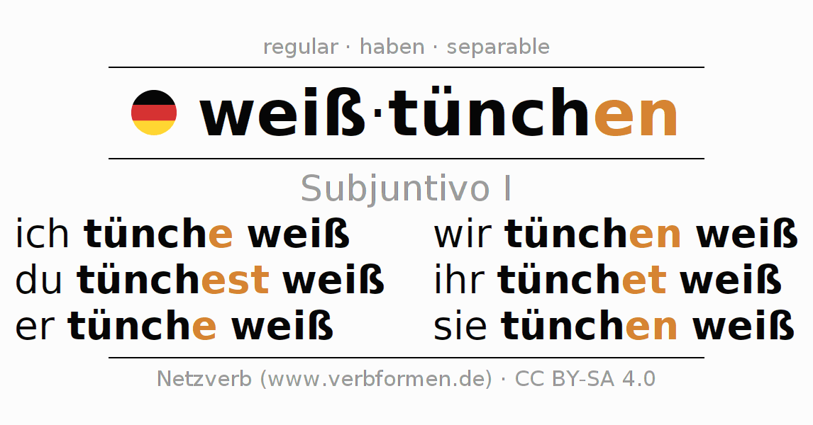 Este verbo weißtünchen (blanquear, encalar) se conjuga en subjuntivo I de la siguiente manera: ich tünche weiß, du tünchest weiß, er tünche weiß, wir tünchen weiß, ihr tünchet weiß, sie tünchen weiß