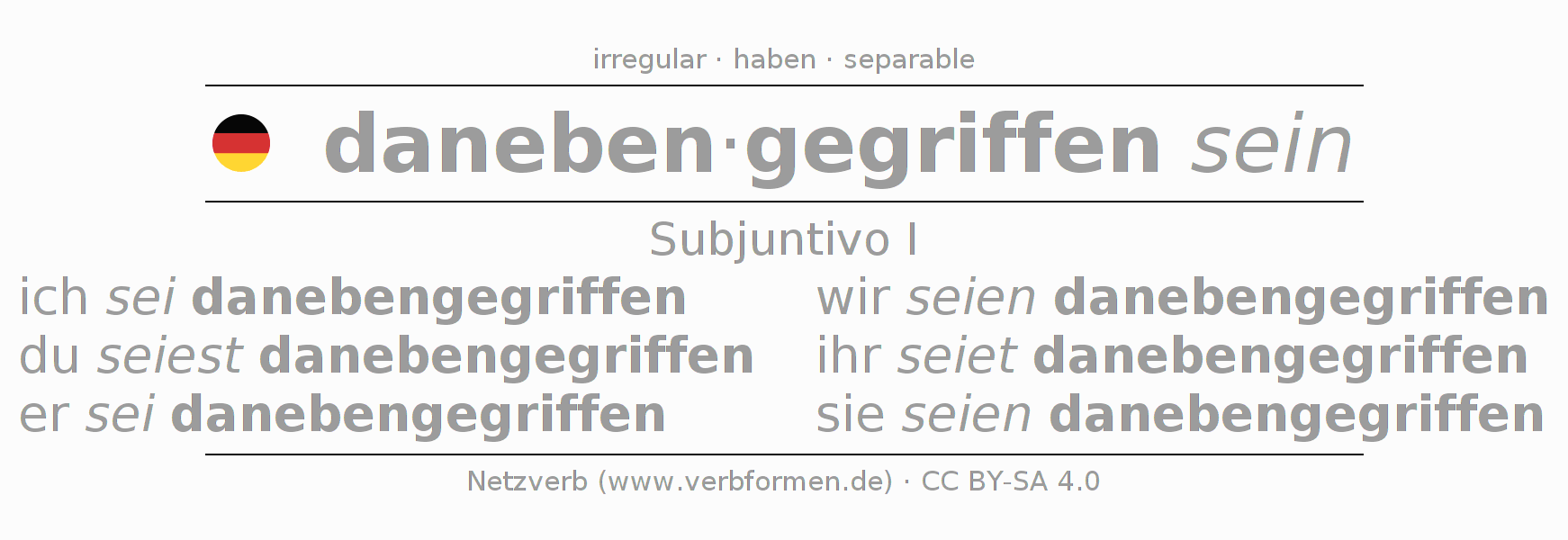 El verbo danebengreifen, conjugado completamente en todas las personas y números gramaticales en Subjuntivo Presente.