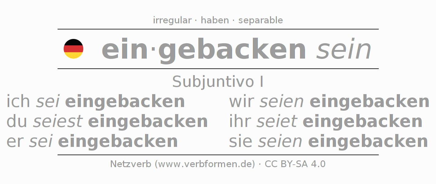 La conjugación de einbacken en Subjuntivo Presente Subjuntivo Pasivo situativo es ich sei eingebacken, du seiest eingebacken, er sei eingebacken, wir seien eingebacken, ihr seiet eingebacken, sie seien eingebacken.Para construir esta formas se requiere seguir algunas reglas gramaticales y también las especificaciones para la conjugación de verbos simples de einbacken en Subjuntivo I . Comentarios ☆