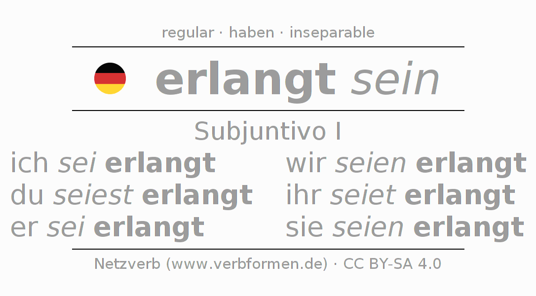 La conjugación de erlangen en Subjuntivo Presente Subjuntivo Pasivo situativo es ich sei erlangt, du seiest erlangt, er sei erlangt, wir seien erlangt, ihr seiet erlangt, sie seien erlangt.Para construir esta formas se requiere seguir algunas reglas gramaticales y también las especificaciones para la conjugación de verbos simples de erlangen en Subjuntivo I . Comentarios ☆