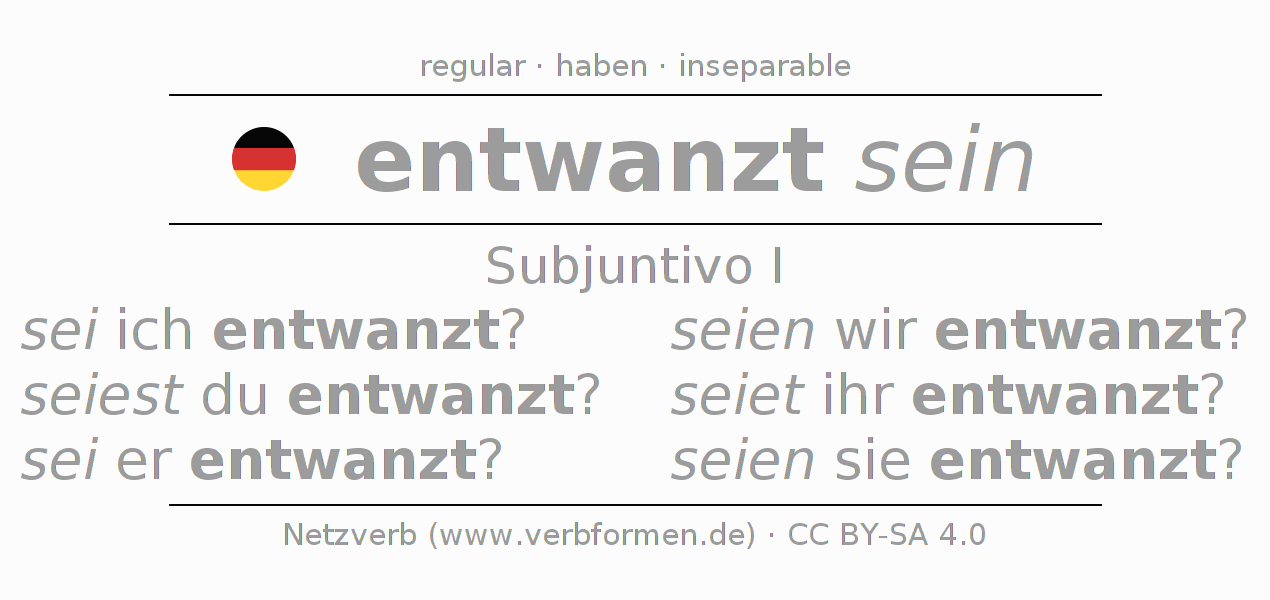 El verbo entwanzen, conjugado completamente en todas las personas y números gramaticales en Subjuntivo Presente.