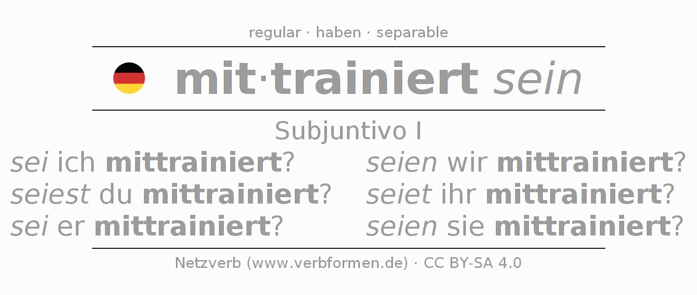 El verbo mittrainieren, conjugado completamente en todas las personas y números gramaticales en Subjuntivo Presente.