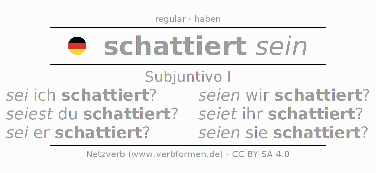 El verbo schattieren, conjugado completamente en todas las personas y números gramaticales en Subjuntivo Presente.