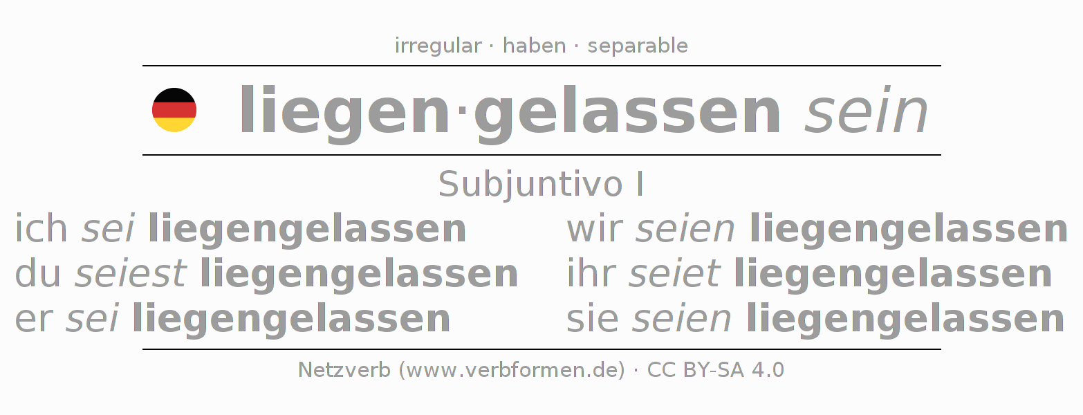 El verbo liegenlassen, conjugado completamente en todas las personas y números gramaticales en Subjuntivo Presente.