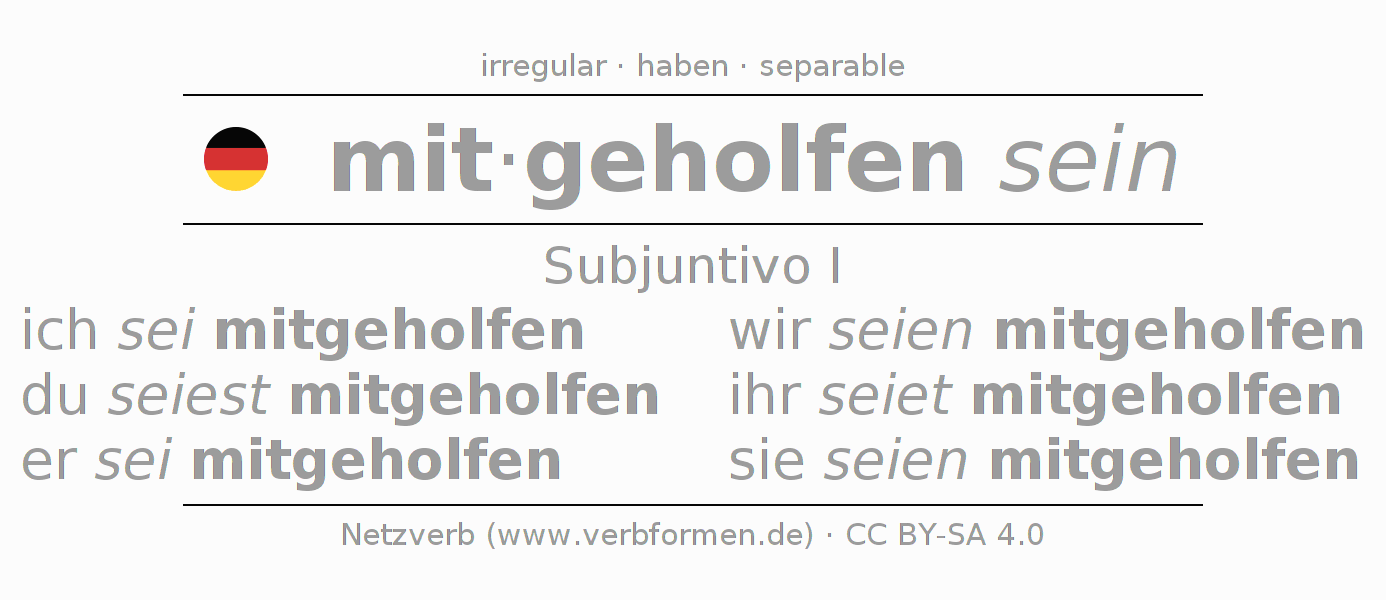 La conjugación de mithelfen en Subjuntivo Presente Subjuntivo Pasivo situativo es ich sei mitgeholfen, du seiest mitgeholfen, er sei mitgeholfen, wir seien mitgeholfen, ihr seiet mitgeholfen, sie seien mitgeholfen.Para construir esta formas se requiere seguir algunas reglas gramaticales y también las especificaciones para la conjugación de verbos simples de mithelfen en Subjuntivo I . Comentarios ☆