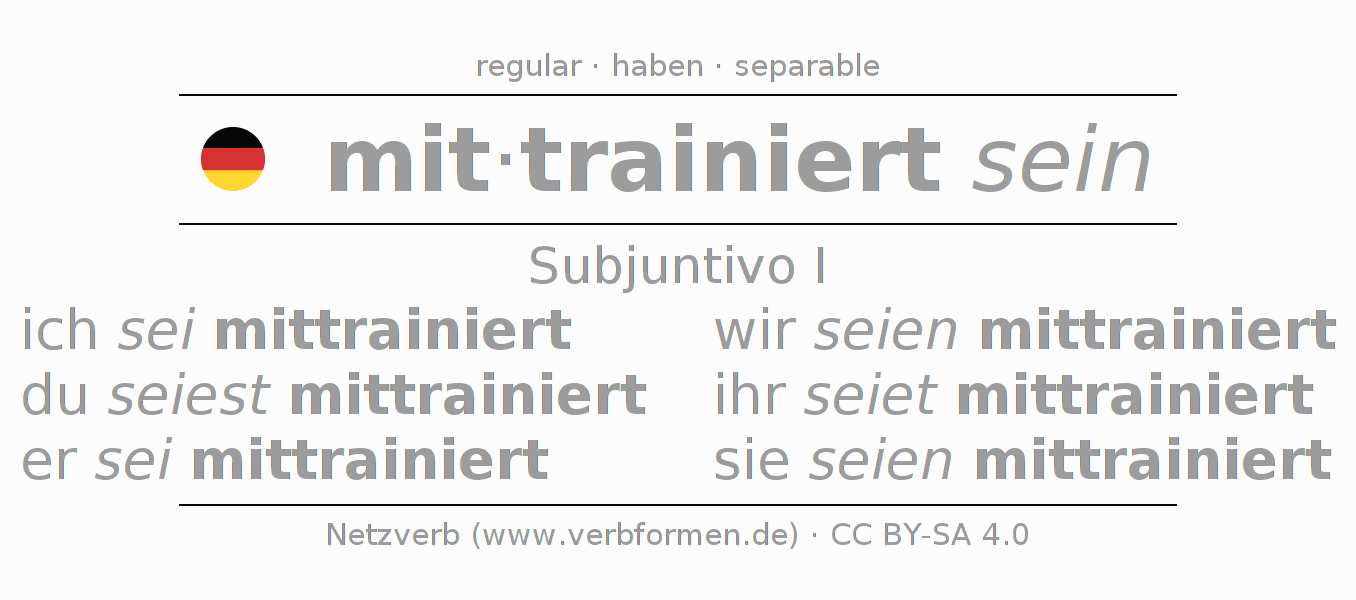El verbo mittrainieren, conjugado completamente en todas las personas y números gramaticales en Subjuntivo Presente.