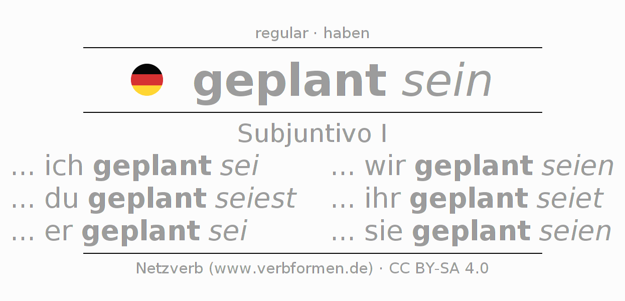 La conjugación de planen en Subjuntivo Presente Subjuntivo Pasivo situativo es ... ich geplant sei, ... du geplant seiest, ... er geplant sei, ... wir geplant seien, ... ihr geplant seiet, ... sie geplant seien.Para construir esta formas se requiere seguir algunas reglas gramaticales y también las especificaciones para la conjugación de verbos simples de planen en Subjuntivo I . Comentarios ☆