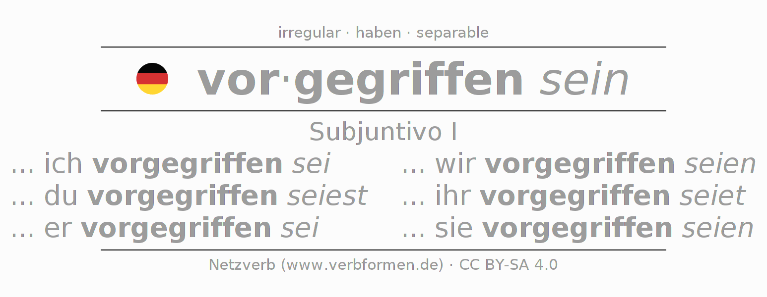 El verbo vorgreifen, conjugado completamente en todas las personas y números gramaticales en Subjuntivo Presente.