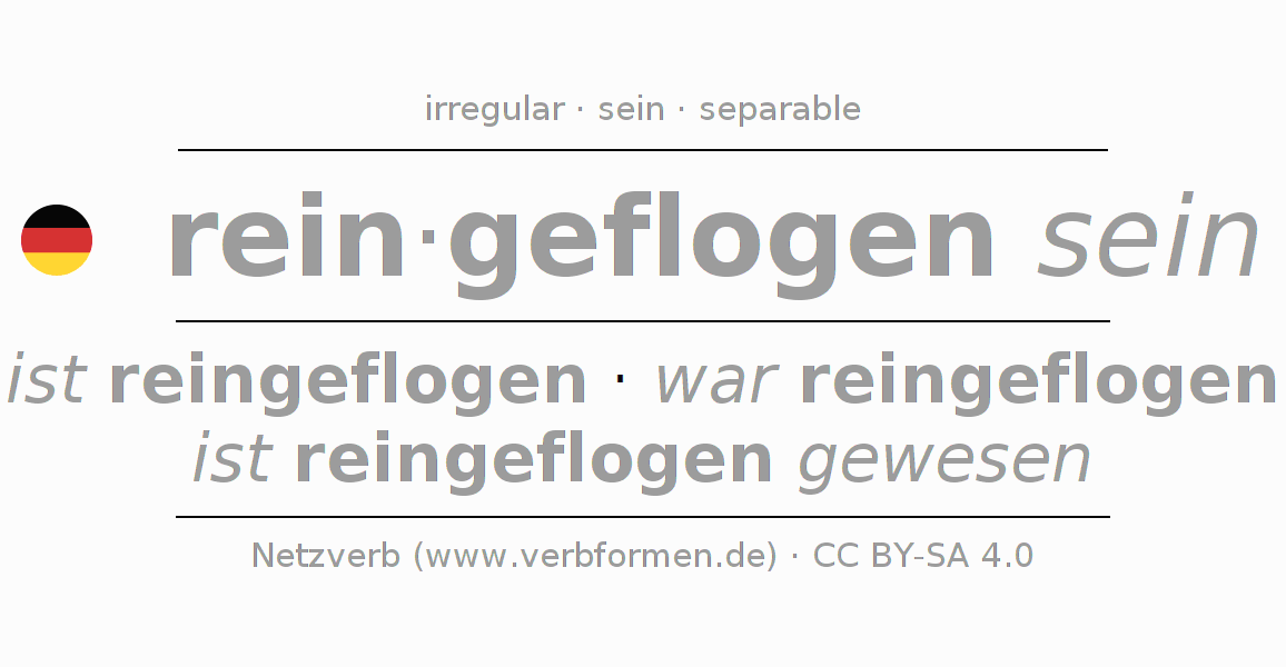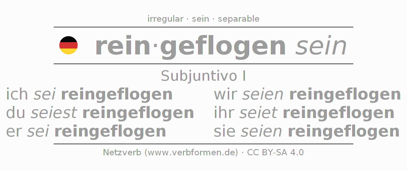 La conjugación de reinfliegen en Subjuntivo Presente Subjuntivo Pasivo situativo es ich sei reingeflogen, du seiest reingeflogen, er sei reingeflogen, wir seien reingeflogen, ihr seiet reingeflogen, sie seien reingeflogen.Para construir esta formas se requiere seguir algunas reglas gramaticales y también las especificaciones para la conjugación de verbos simples de reinfliegen en Subjuntivo I . Comentarios ☆