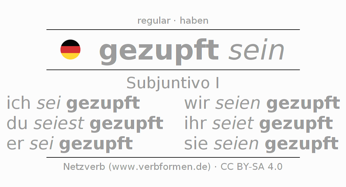 El verbo zupfen, conjugado completamente en todas las personas y números gramaticales en Subjuntivo Presente.