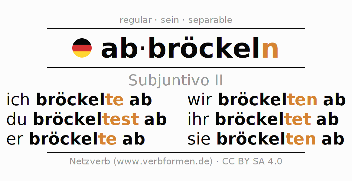 Este verbo abbröckeln (desprenderse, desmoronarse) se conjuga en subjuntivo II de la siguiente manera: ich bröckelte ab, du bröckeltest ab, er bröckelte ab, wir bröckelten ab, ihr bröckeltet ab, sie bröckelten ab