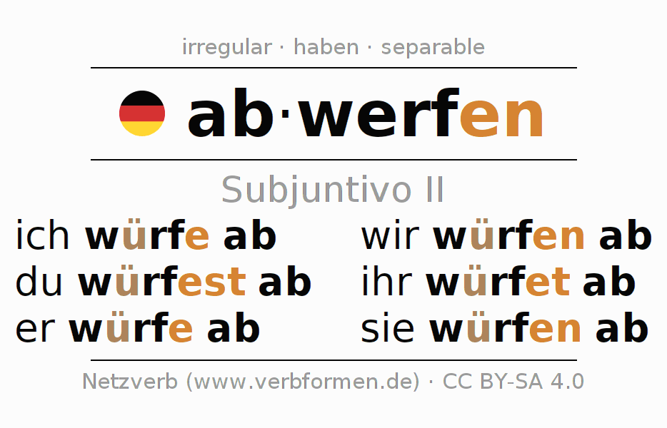 El verbo abwerfen, conjugado completamente en todas las personas y números gramaticales en Subjuntivo Pretérito.