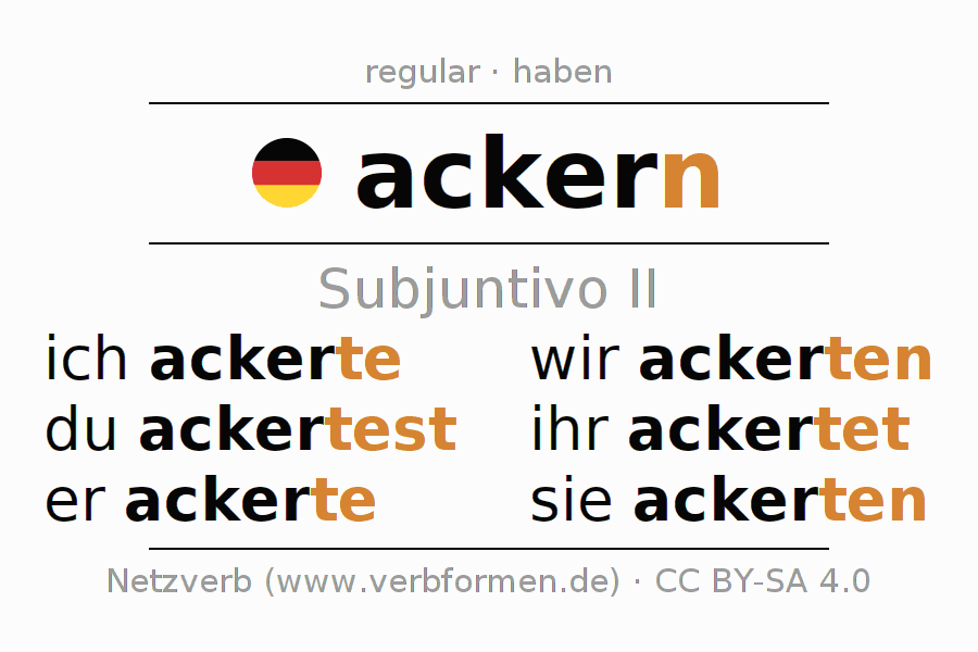 Este verbo ackern (arar, labrar) se conjuga en subjuntivo II de la siguiente manera: ich ackerte, du ackertest, er ackerte, wir ackerten, ihr ackertet, sie ackerten
