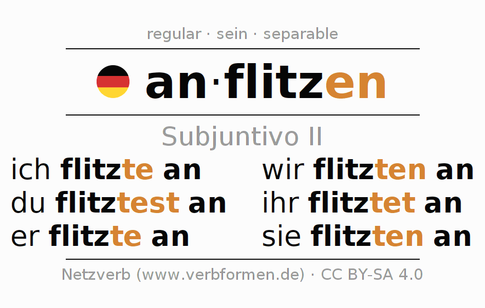 Este verbo anflitzen (acercarse rápido, venir rápido) se conjuga en subjuntivo II de la siguiente manera: ich flitzte an, du flitztest an, er flitzte an, wir flitzten an, ihr flitztet an, sie flitzten an