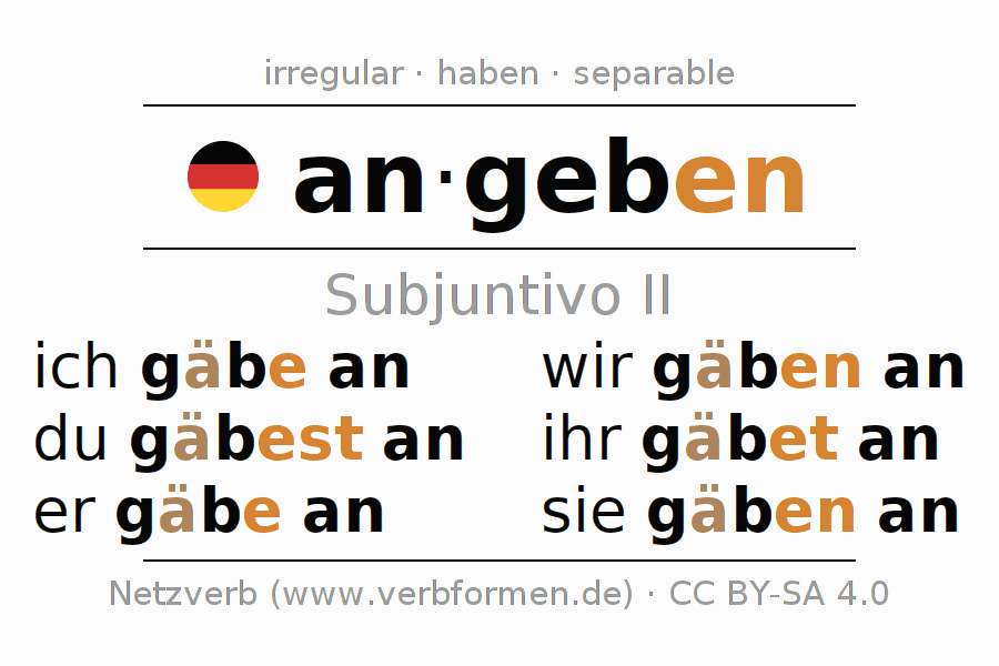Este verbo angeben (fanfarronear, indicar) se conjuga en subjuntivo II de la siguiente manera: ich gäbe an, du gäbest an, er gäbe an, wir gäben an, ihr gäbet an, sie gäben an