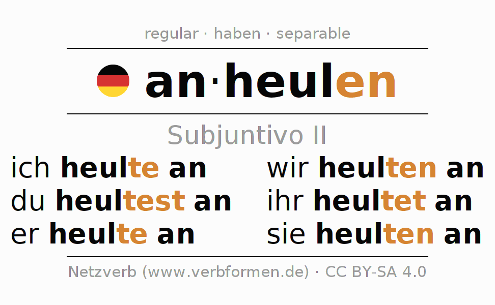 Este verbo anheulen (protestar, quejarse) se conjuga en subjuntivo II de la siguiente manera: ich heulte an, du heultest an, er heulte an, wir heulten an, ihr heultet an, sie heulten an