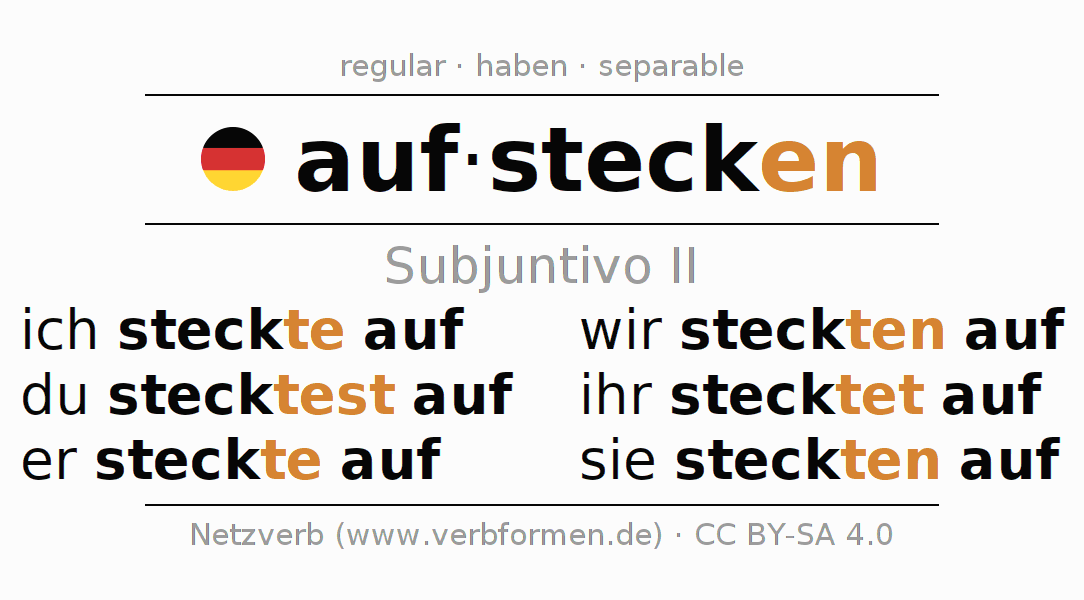 El verbo aufstecken, conjugado completamente en todas las personas y números gramaticales en Subjuntivo Pretérito.